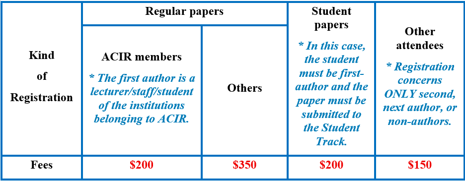 The conference fee, which includes access to the conference sessions, conference material, conference proceedings (e-Version), daily tea-breaks, welcome reception, and Gala dinner FOR ONE PERSON ONLY and does not include accommodation, airport transfer, or other expenses not above-mentioned.